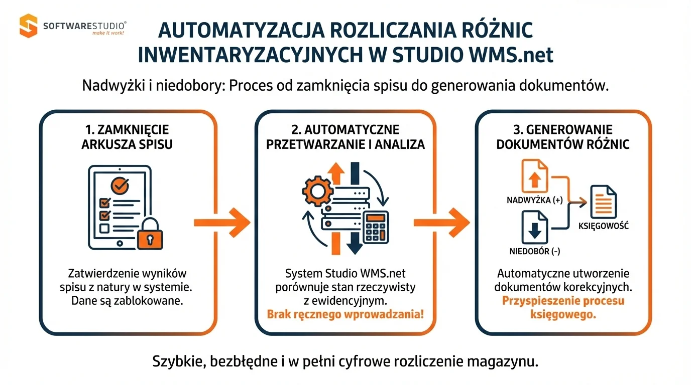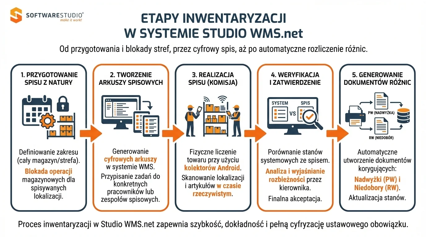 System Studio WMS.net automatyzuje proces inwentaryzacji poprzez wykorzystanie kolektorów danych z systemem Android, co eliminuje błędy ludzkie wynikające z ręcznego przepisywania danych. Oprogramowanie pozwala na tworzenie arkuszy spisowych w czasie rzeczywistym, natychmiastowe porównanie odczytów z kodów kreskowych ze stanem systemowym oraz szybkie generowanie protokołów różnic. Dzięki temu inwentaryzacja może odbywać się w sposób ciągły (cykliczny) bez konieczności całkowitego wstrzymywania pracy magazynu.