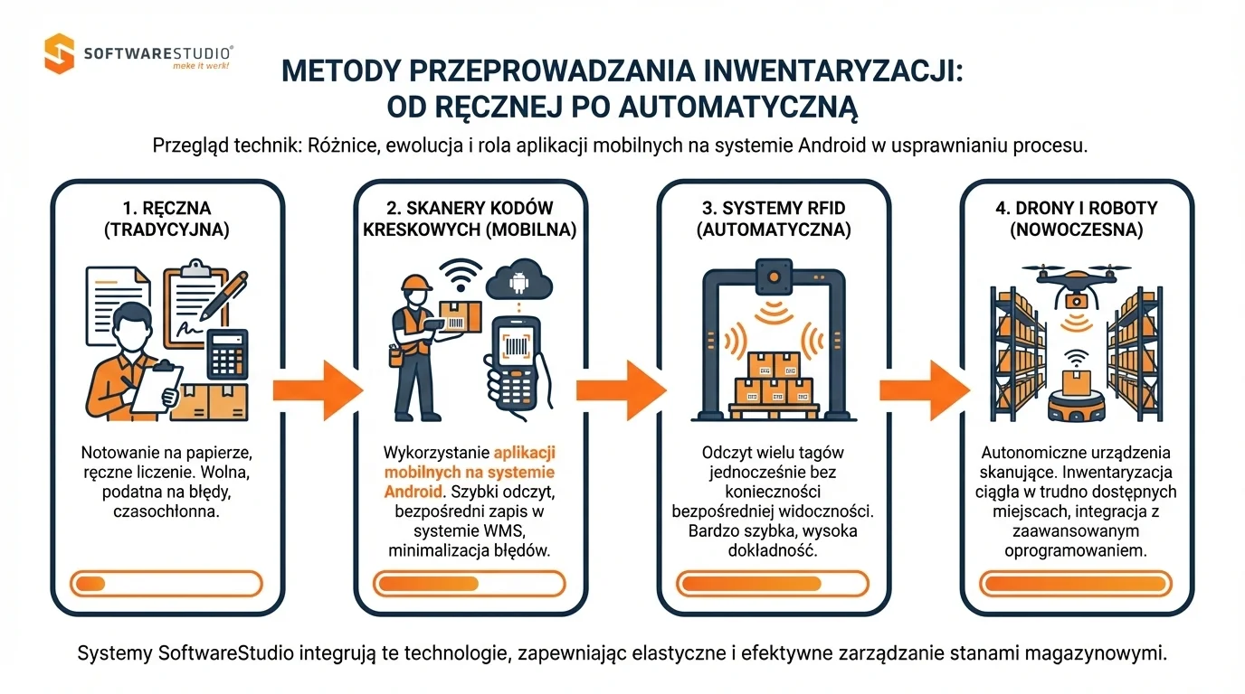 | Inwentaryzacja ze skanerami kodów | Terminale mobilne (kolektory danych), system WMS, etykiety z kodami kreskowymi | Szybkość wyższa o 30-40% od metody ręcznej, eliminacja pomyłek przy wpisywaniu danych, natychmiastowa weryfikacja z systemem | Standardowe magazyny e-commerce i dystrybucyjne, gdzie kluczowa jest dokładność i integracja z WMS |