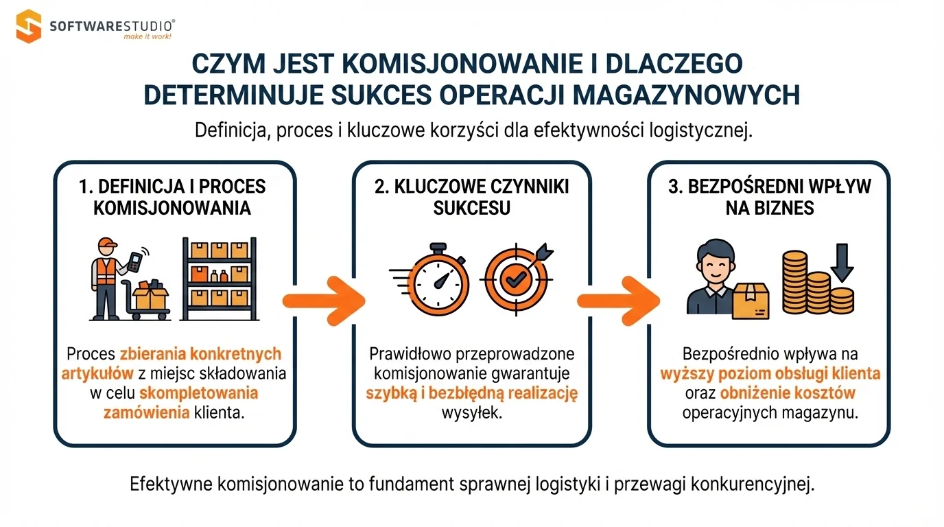 Komisjonowanie (ang. order picking) to proces pobierania określonych towarów z miejsc składowania w celu skompletowania zamówienia klienta. W systemie Studio WMS.net proces ten jest wspierany przez algorytmy optymalizacji ścieżki zbiórki, które prowadzą magazyniera przez najkrótszą możliwą trasę. Dzięki wykorzystaniu terminali Android, pracownik w czasie rzeczywistym potwierdza pobranie każdej jednostki, co niemal całkowicie eliminuje błędy w wysyłkach.