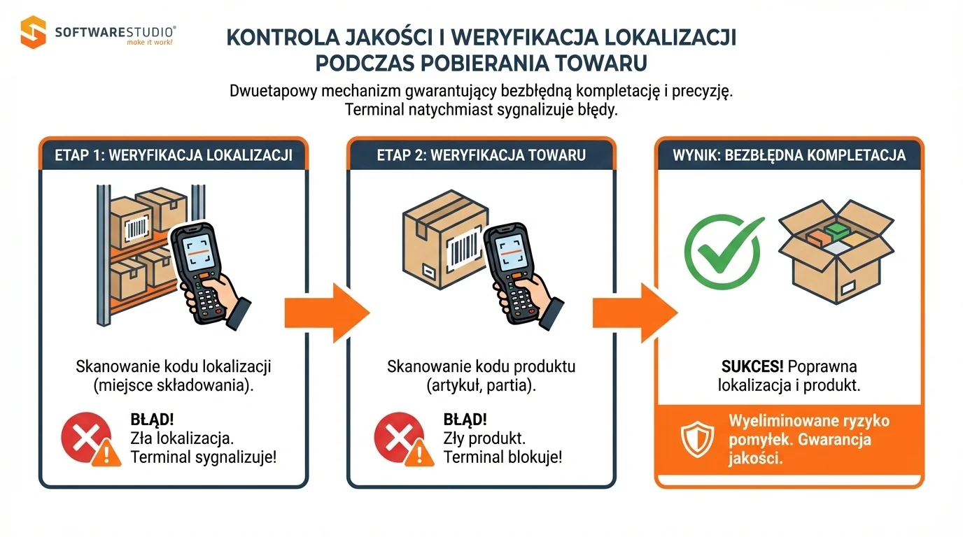 Stosujemy dwuetapową kontrolę kodów kreskowych, która obejmuje skanowanie zarówno lokalizacji magazynowej, jak i samego towaru. Dlatego operator ma pewność, że znajduje się przy właściwym regale i pobiera dokładnie ten produkt, który widnieje w zleceniu. Wykorzystanie Studio WMS.net na terminalach mobilnych czyni ten proces płynnym i intuicyjnym dla każdego pracownika. Takie rozwiązanie jest istotne dla zachowania wzorcowej precyzji w magazynie wysokiego składowania.